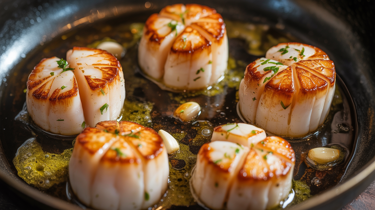 - Flip and Baste: Flip the scallops carefully using tongs. Add butter and minced garlic to the pan. As the butter melts, tilt the pan and use a spoon to baste the scallops with the melted butter for additional flavor. Cook for another 1-2 minutes until the scallops are opaque and tender.